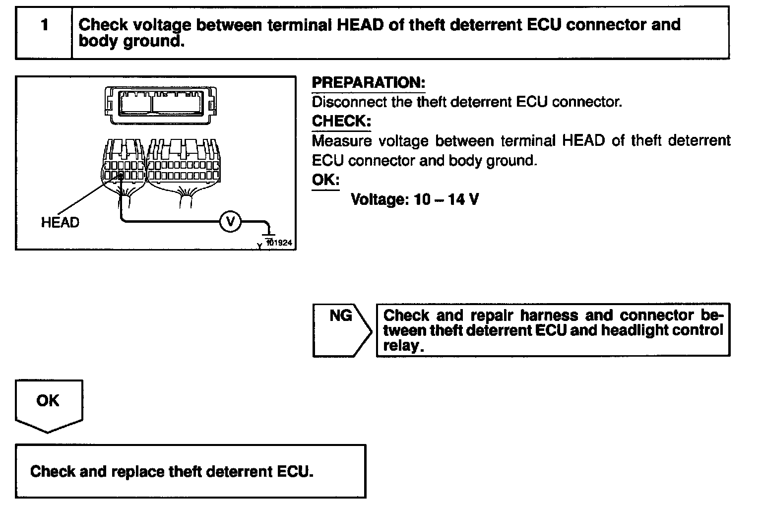 CIRCUIT DESCRIPTIONWhen the theft deterrent system is activated, it causes the Tr in the ECU to switch ON and OFF at approximately 0.4 sec. intervals. This switches the headlight control relay ON and OFF, thus flashing the headlights.