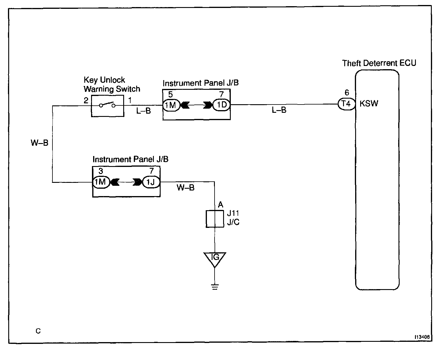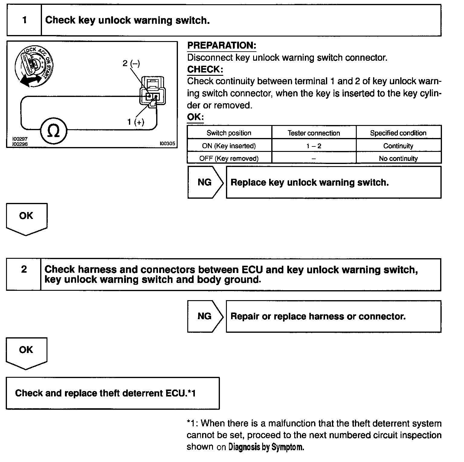 CIRCUIT DESCRIPTIONThe key unlock warning switch goes ON when the ignition key is inserted in the key cylinder and goes OFF when the ignition key is removed.