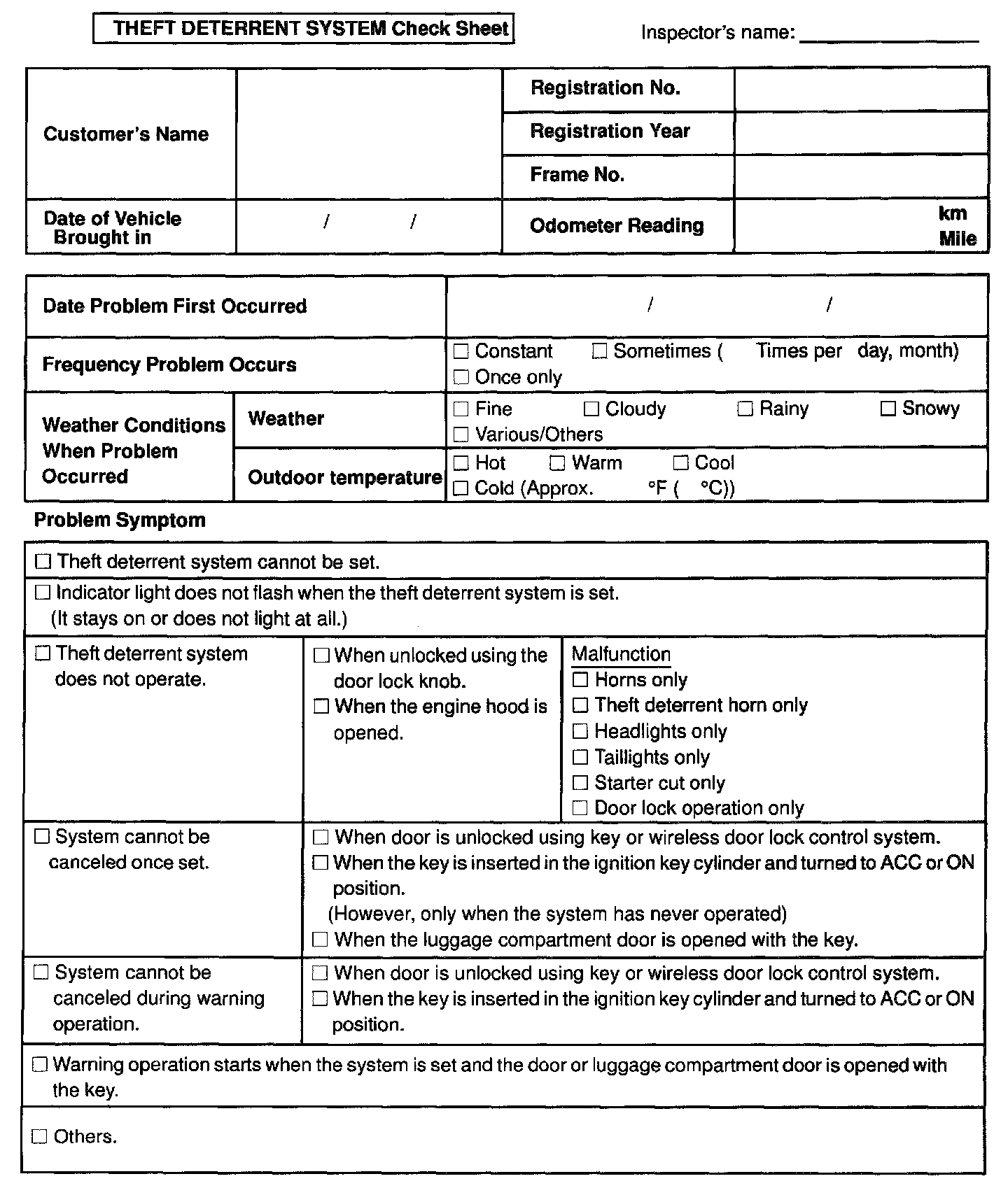 Theft Deterrent System Check Sheet: