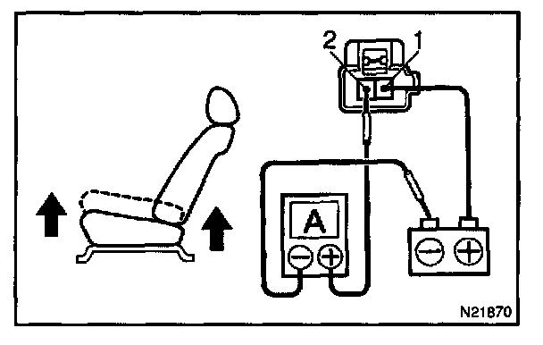 a. Connect the positive (+) lead from the battery to terminal 2, the positive (+) lead from the ammeter to terminal 1 and the negative (-) lead to the battery negative (-) terminal, then recline the seat back to the most forward position.