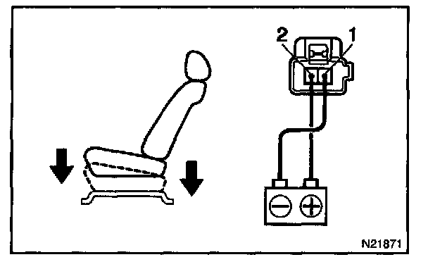 d. Approximately 60 seconds later, connect the positive (+) lead from the battery to terminal 2 and the negative (-) lead to terminal 1, check that the seat cushion begins to move backwards.