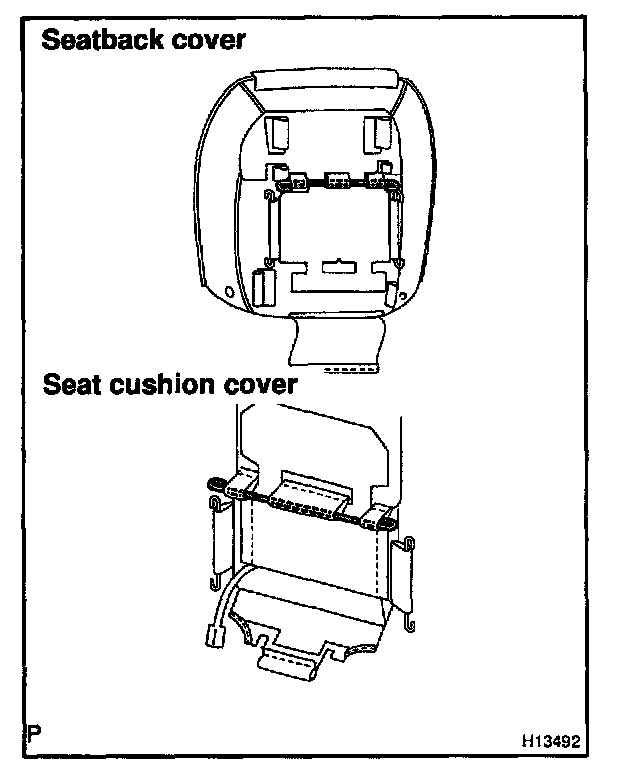 Install the seat covers with new hog rings to the seat cushion pad and the seatback pad.