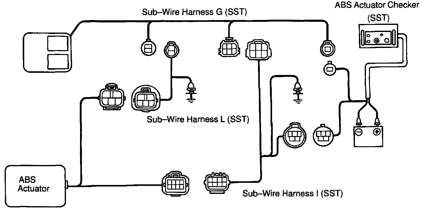 HINT: Using the ABS actuator checker (SST), check the operation of the actuator. If the actuator does not operate, check the operation of sub-wire harness G. If the solenoid and/or pump motor relay are abnormal, replace the relay and inspect the actuator operation again.