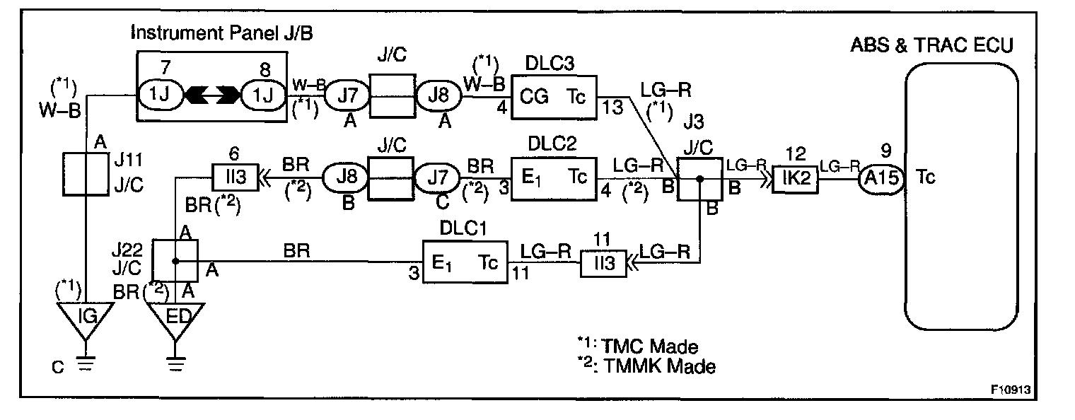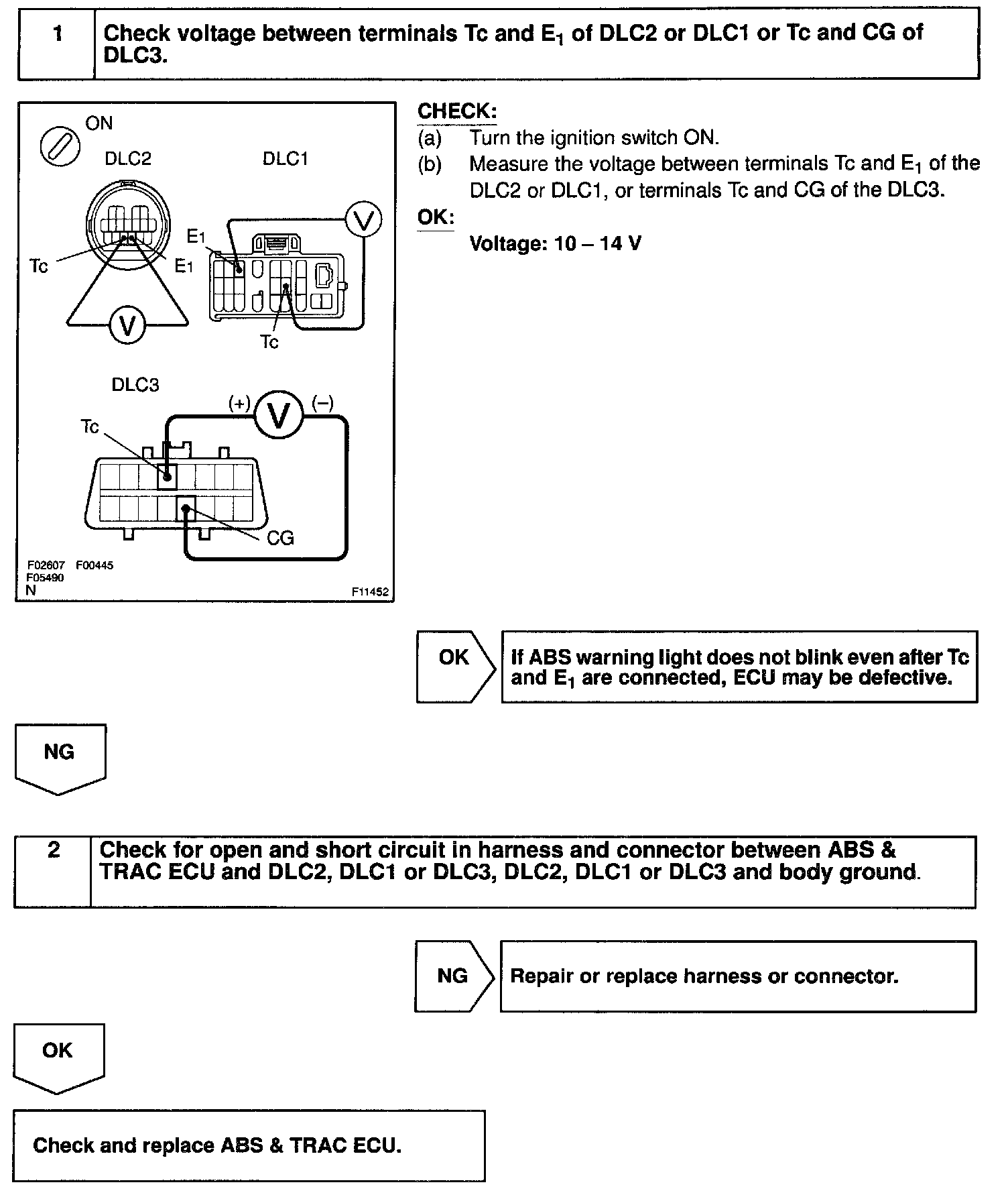 CIRCUIT DESCRIPTIONConnecting terminals Tc and E1 of the DLC1 or the DLC2, or terminals Tc and CG of the DLC3 causes the ECU to display the DTC by blinking the ABS warning light and TRAC OFF indicator light.