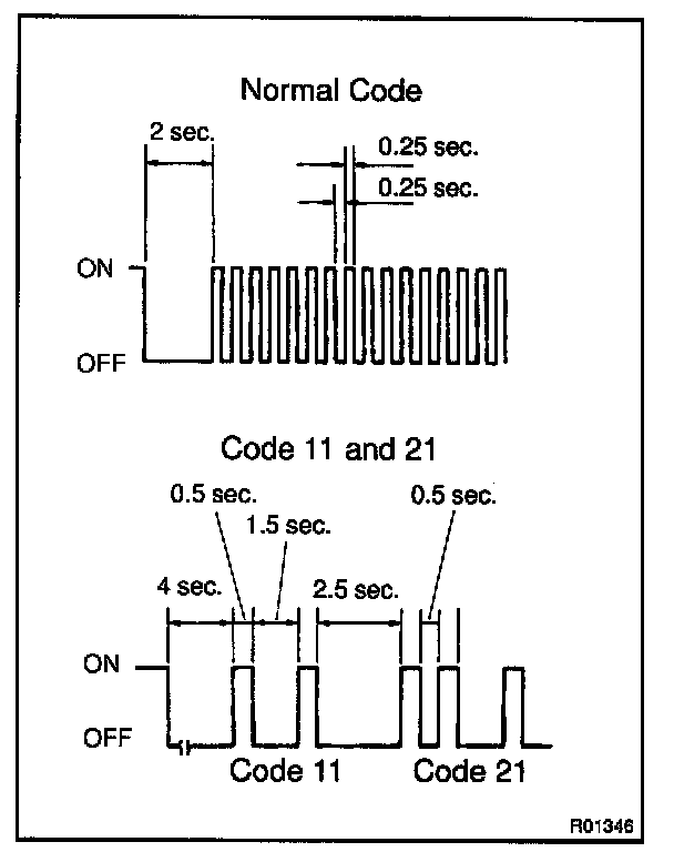 - As an example, the blinking patterns of the normal code and codes 11 and 21 are shown in the illustration.