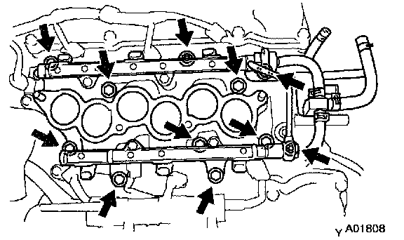 d. Remove the 9 bolts, 2 nuts, 2 plate washers, the intake manifold, delivery pipes and injectors assembly.