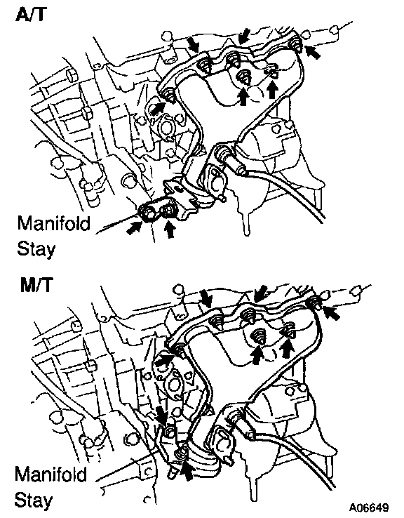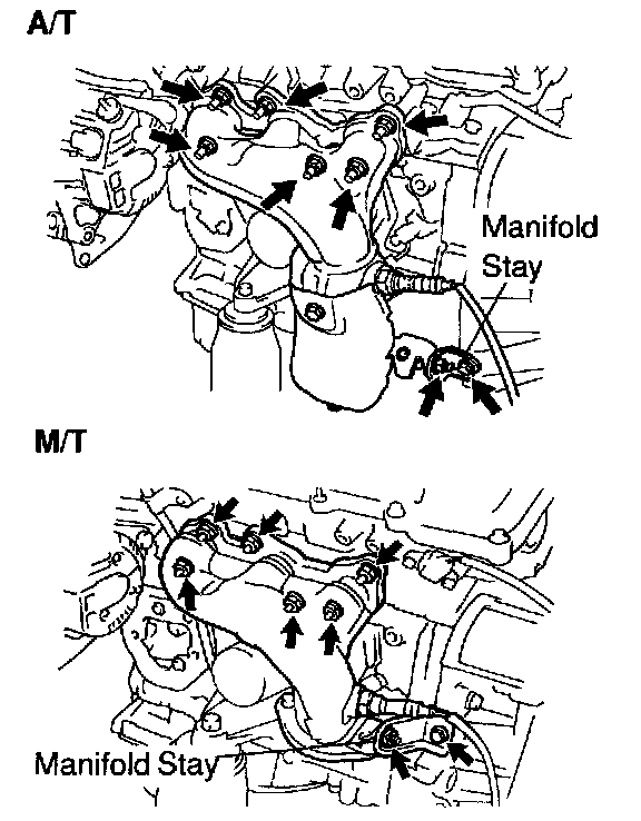 c. A/T: Remove the bolt, nut and exhaust manifold stay.