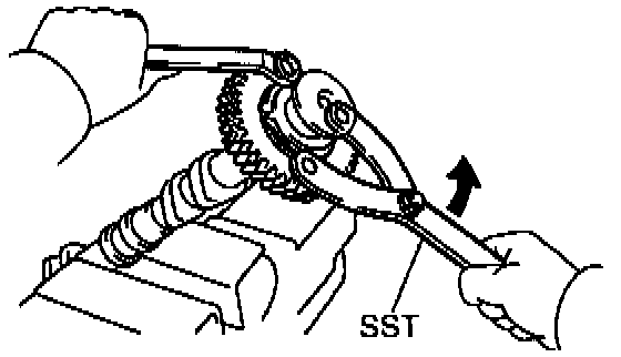 HINT: When removing the camshaft, make sure that the torsional spring force of the sub gear has been eliminated by the operation.