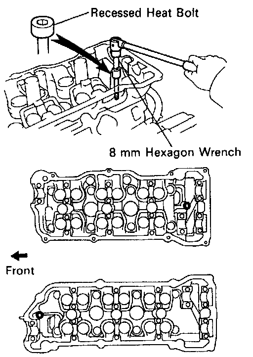 a. Using an 8 mm hexagon wrench, remove the cylinder head (recessed head) bolt on each cylinder head, then repeat for the other side, as shown.