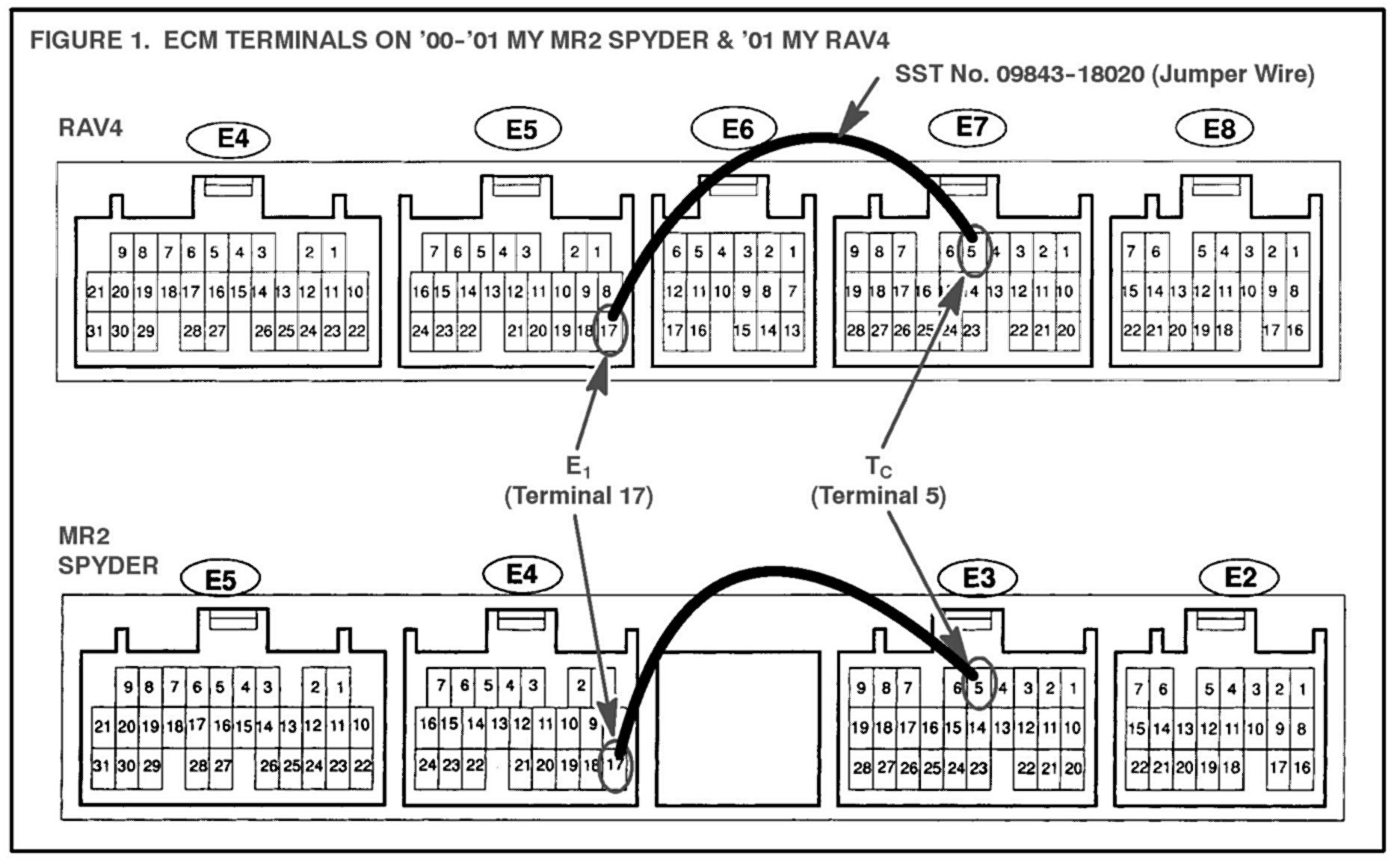 Before beginning the Key Code Reset function on 2000 and later model year MR2 Spyder and 2001 model year RAV4 vehicles, it is necessary to short terminals Tc to E1 at the ECM connector, using SST No. 09843-18020. (Refer to Figure 1.)