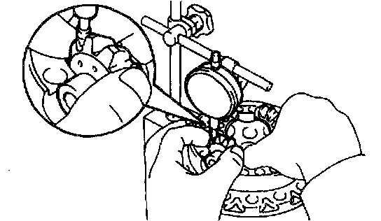 d. Using a dial indicator, measure the backlash of the pinion gear while holding the differential left case.