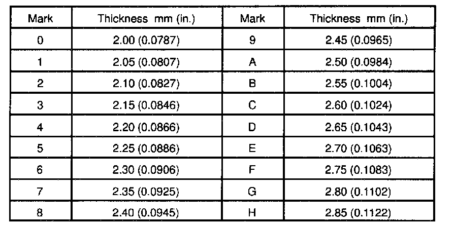 f. Refer to the table, and select the thrust washer which will ensure that the backlash is within the specification. Try to select a washer of the same size.