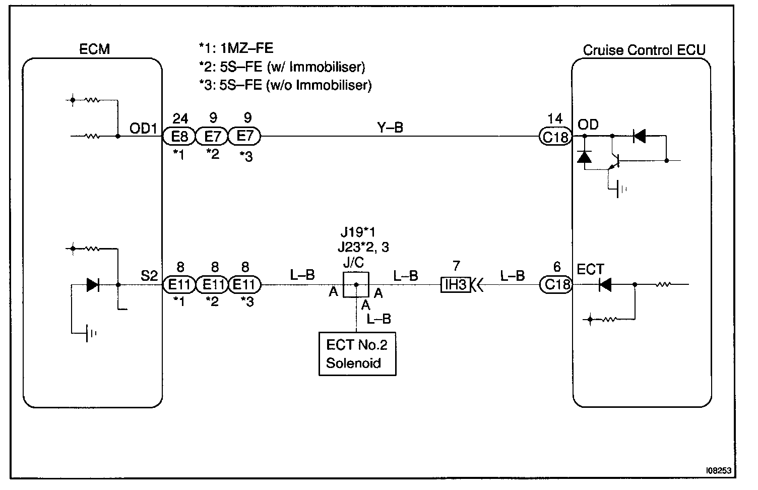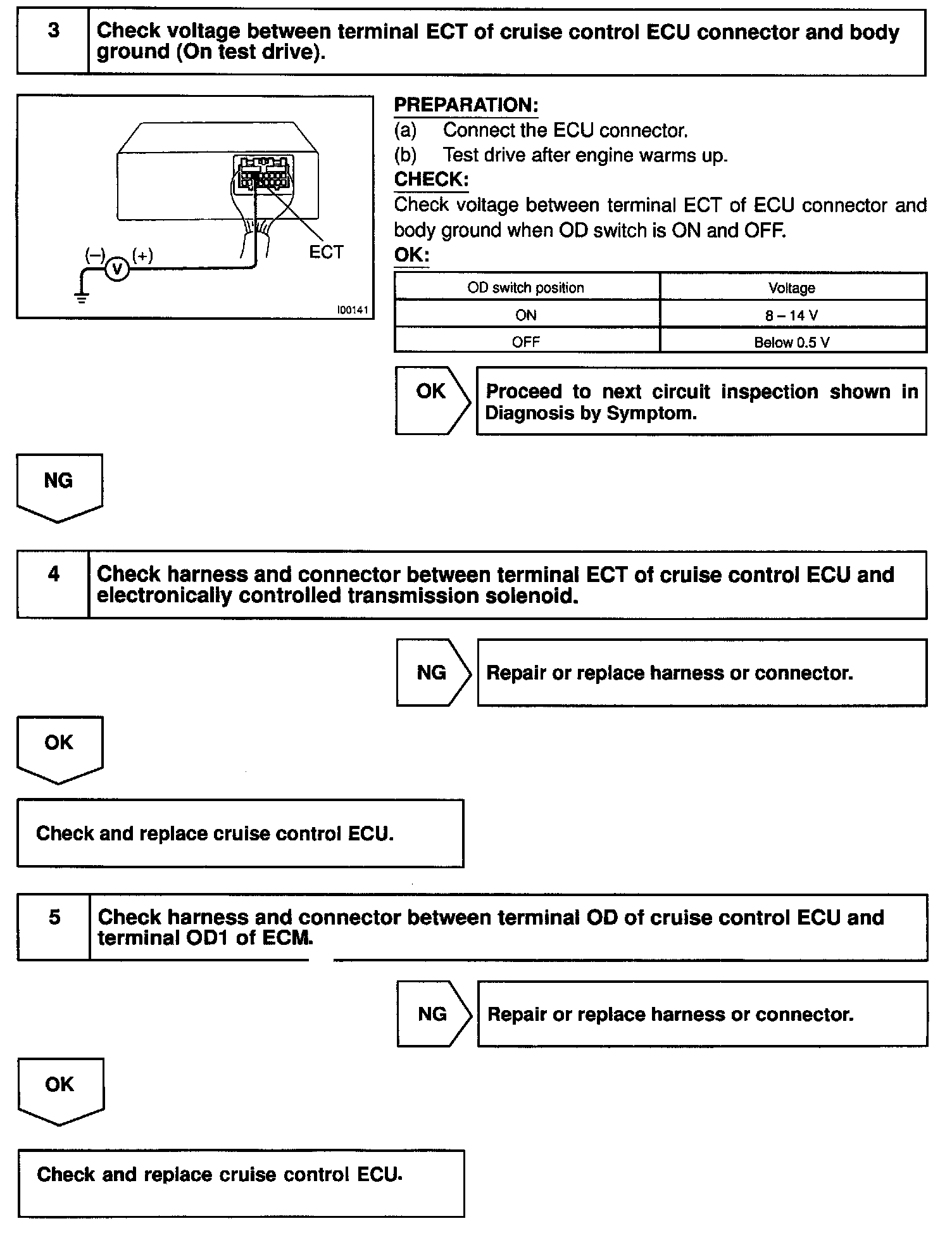Terminal ECT of the cruise control ECU detects the shift change signal (output to electronically controlled transmission No.2 solenoid) from the ECM.