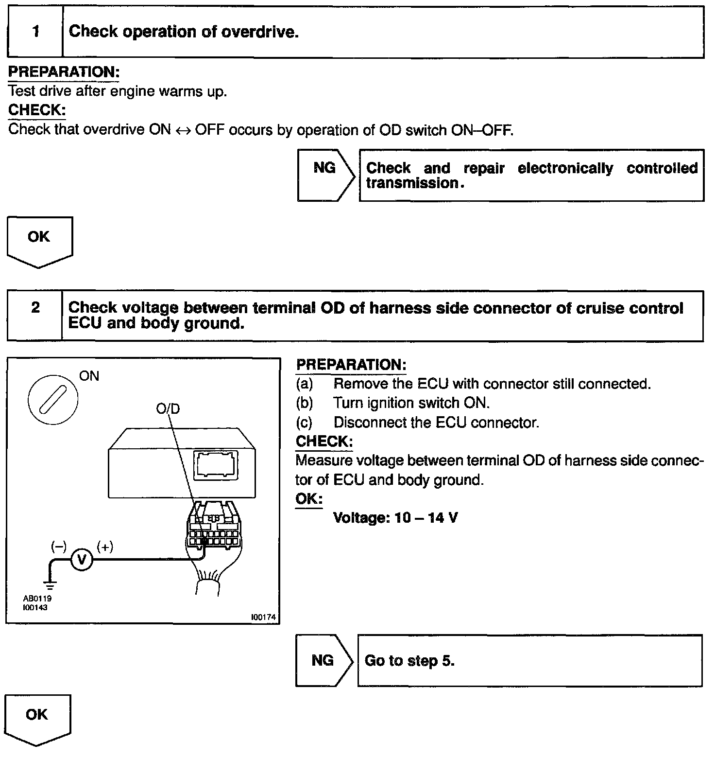 If the vehicle speeds down, also when terminal ECT of the cruise control ECU receives down shifting signal, it sends a signal from terminal OD to ECM to cut overdrive until the end of the uphill slope, and the gear shifts are reduced and gear shift points in the electronically controlled transmission are changed.