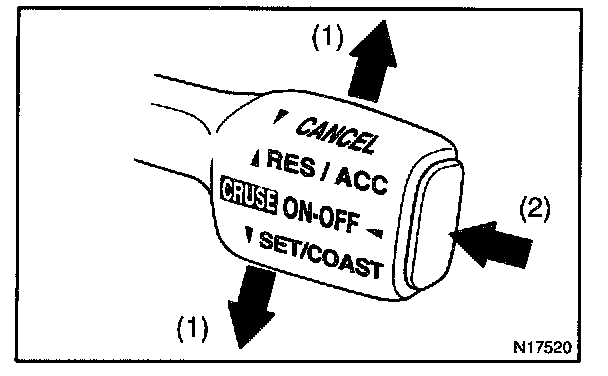 a. Press the control switch to SET/COAST or RES/ACC position and hold it down or hold it up "(1)".
