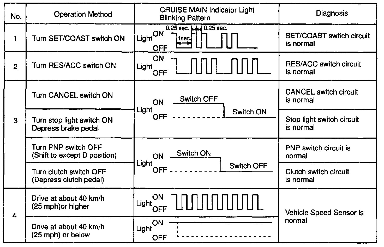 f. Read the blinking pattern of the CRUISE MAIN indicator light.