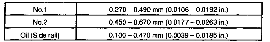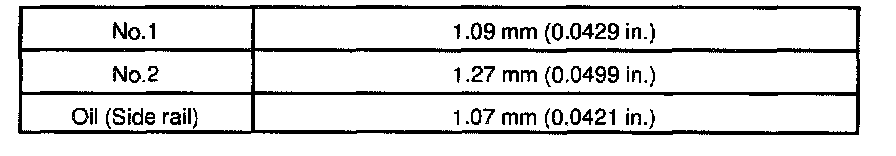 Ring groove clearance (No. 1, No. 2): 0.030 - 0.070 mm (0.0012 - 0.0028 inch)