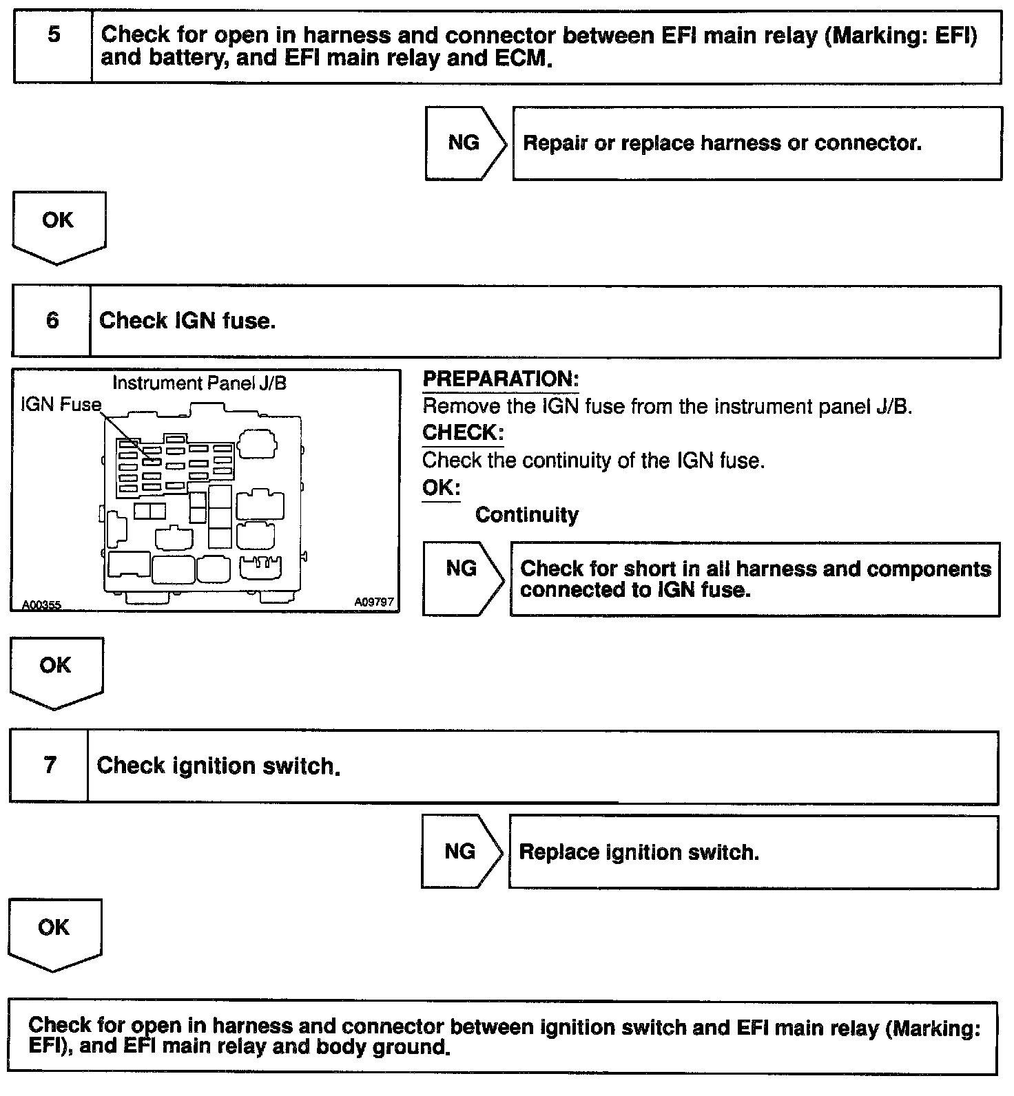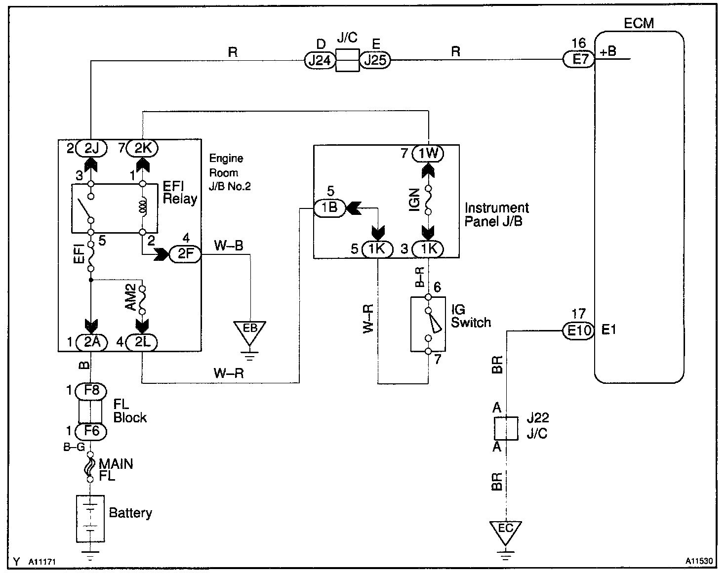 When the ignition switch is turned ON, battery positive voltage is applied to the coil, closing the contacts of the EFI main relay (Marking: EFI) and supplying power to terminal +B of the ECM.