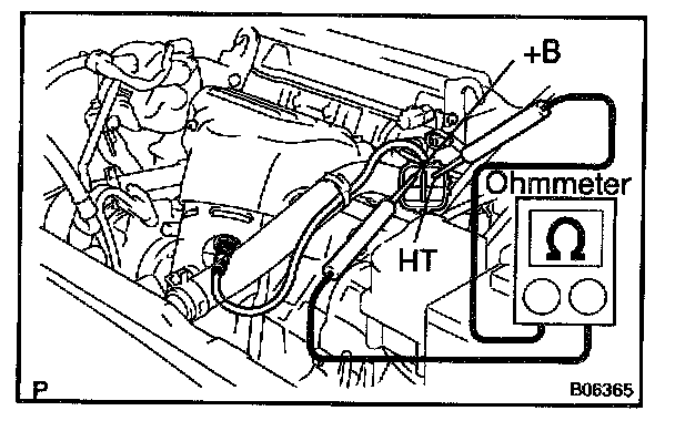 b. Using an ohmmeter, measure the resistance between terminals +B and HT.