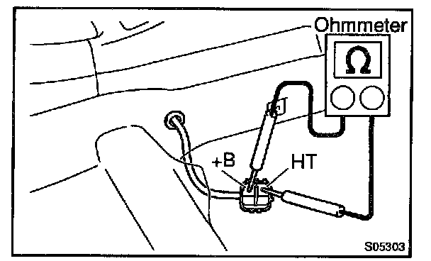 b. Using an ohmmeter, measure the resistance between terminals +B and HT.