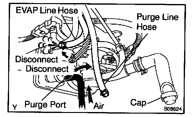 a. Disconnect the purge line hose and EVAP line hose from the charcoal canister.