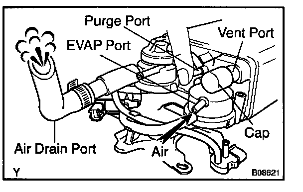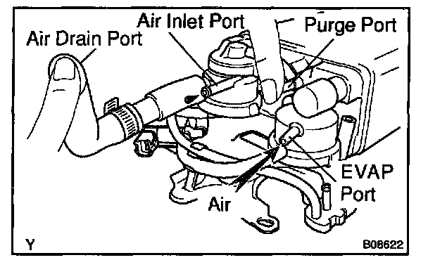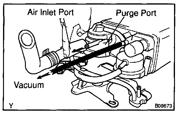 5. While holding the air inlet port closed, apply vacuum (3.43 kPa, 25.7 mm Hg, 1.01 in.Hg) to the EVAP port and check that air flows into the purge port.