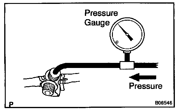 a. Disconnect the EVAP line hose from the charcoal canister side and then pressurize and make the internal pressure in the fuel tank 4 kPa (41 gf/sq.cm, 0.58 psi).
