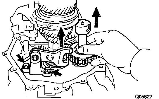 b. Remove the 2 bolts and pull off the reverse shift arm.