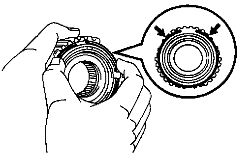 b. Check the braking effect of the synchronizer ring. Turn the middle No. 5 synchronizer ring in one direction while pushing it to the outer No. 5 synchronizer ring. Check that the ring locks.