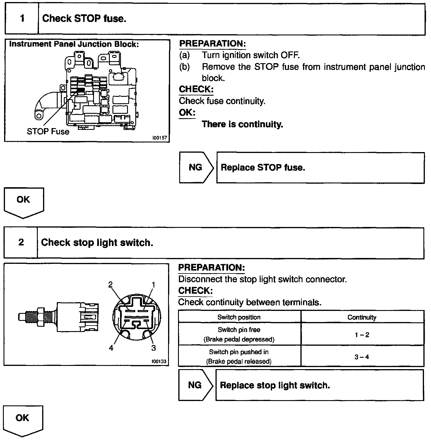 When the brake pedal is depressed, the stop light switch turns on, supplying electrical power to the stop light. Power supply to the magnetic clutch is mechanically cut and the magnetic clutch is turned OFF. When driving downhill, if the vehicle speed exceeds the set speed by 15 km/h (9 mph), the ECU turns the safety magnet clutch OFF. If the vehicle speed later drops to within 10 km/h (6 mph), cruise control at the set speed is resumed.