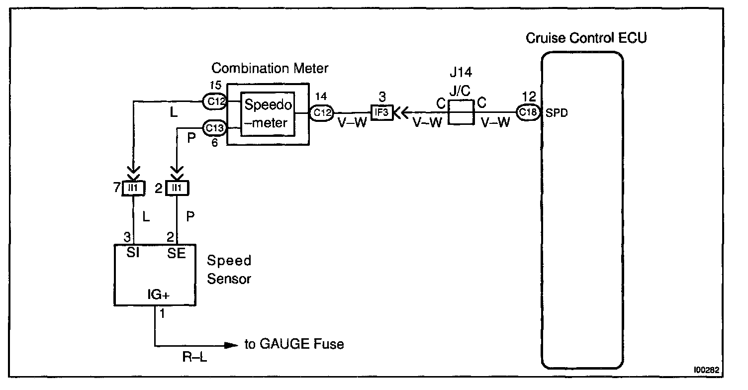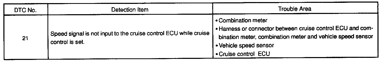 The signal from the vehicle speed sensor circuit is sent to cruise control ECU as vehicle speed signal.