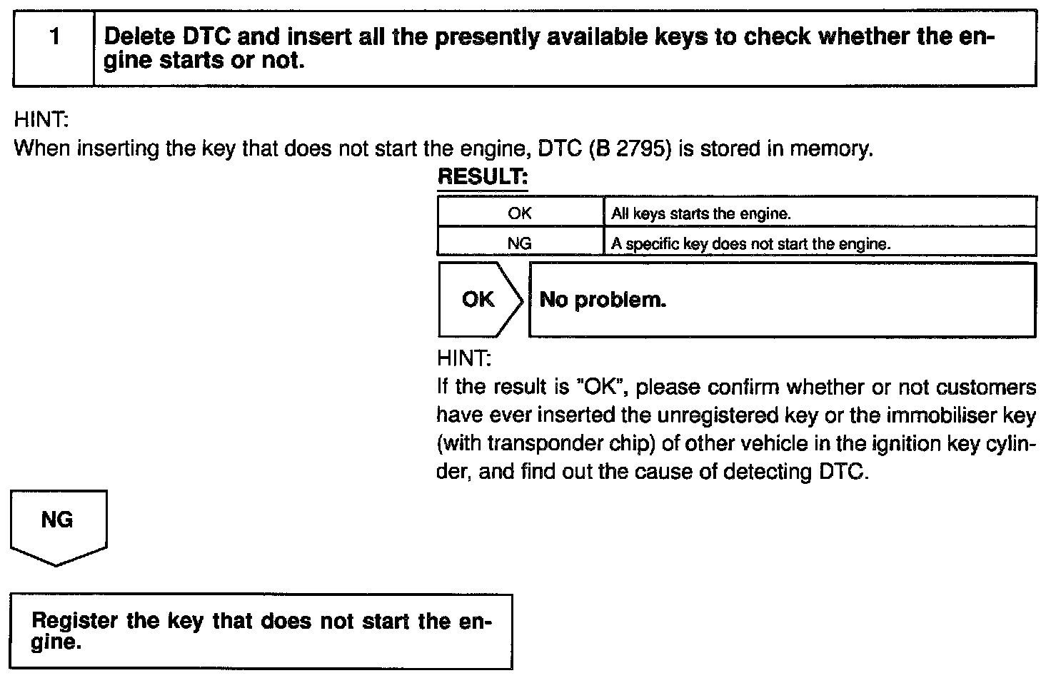 When a key that outputs B2795 is found, register this key. when B2795 is not output, there is a possibility that the unregistered key has been inserted before. (ECM is normal.)