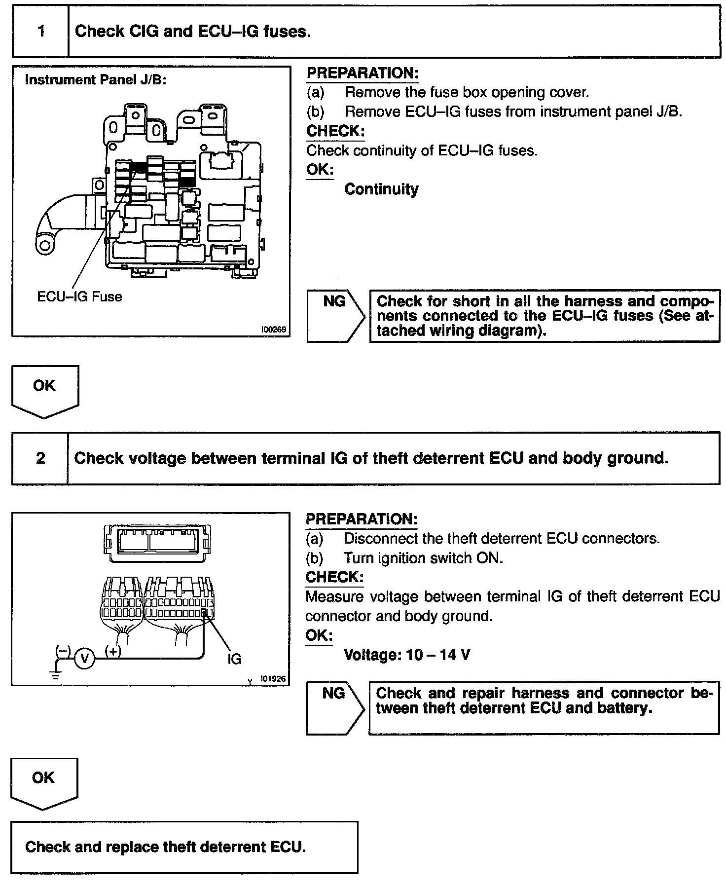 When the ignition switch is turned to the ACC position, battery positive voltage is applied to the terminal ACC of the ECU. Also, if the ignition switch is turned to the ON position, battery positive voltage is applied to the terminals ACC and IG of the ECU. When the battery positive voltage is applied to the terminal ACC of the ECU while the theft deterrent system is activated, the warning stops. Furthermore, power supplied from the terminals ACC and IG of the ECU is used as power for the door courtesy switch, and position switch, etc.