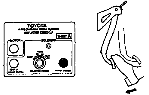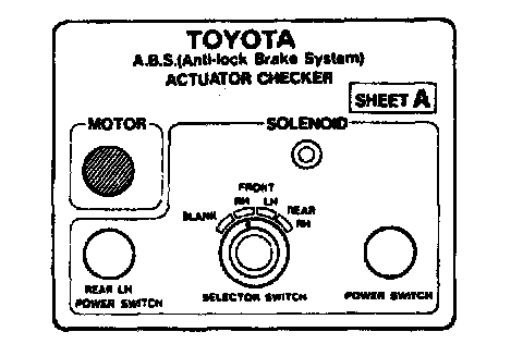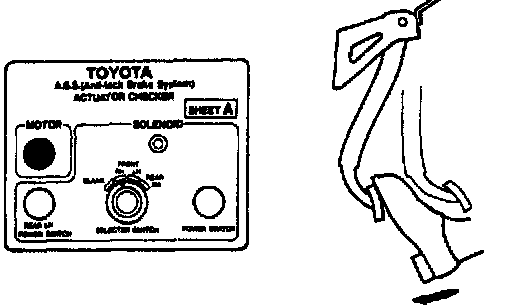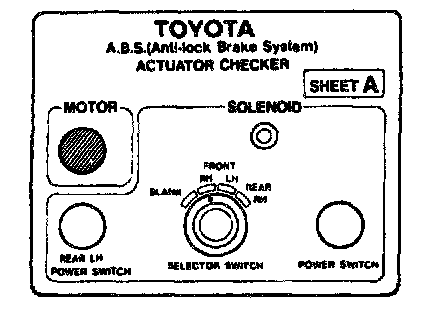 ON-VEHICLE INSPECTIONHINT: Using the ABS actuator checker (SST), check the operation of the actuator. If the actuator does not operate, check the operation of sub-wire harness G according to the instructions. Refer to Antilock Brake System; Testing and Inspection; Procedures; Trouble Code Diagnostic Procedures; then see DTCs 11/12 and 13/14. If the solenoid and/or pump motor relay are abnormal, replace the relay and inspect the actuator operation again.