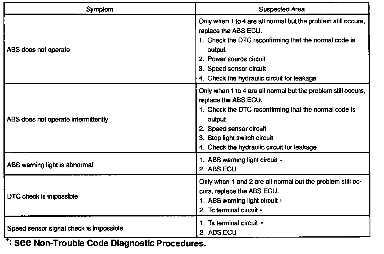 If a normal code is displayed during the DTC check but the problem still occurs, check the circuits for each problem symptom in the order given in the table, and proceed to the relevant troubleshooting.