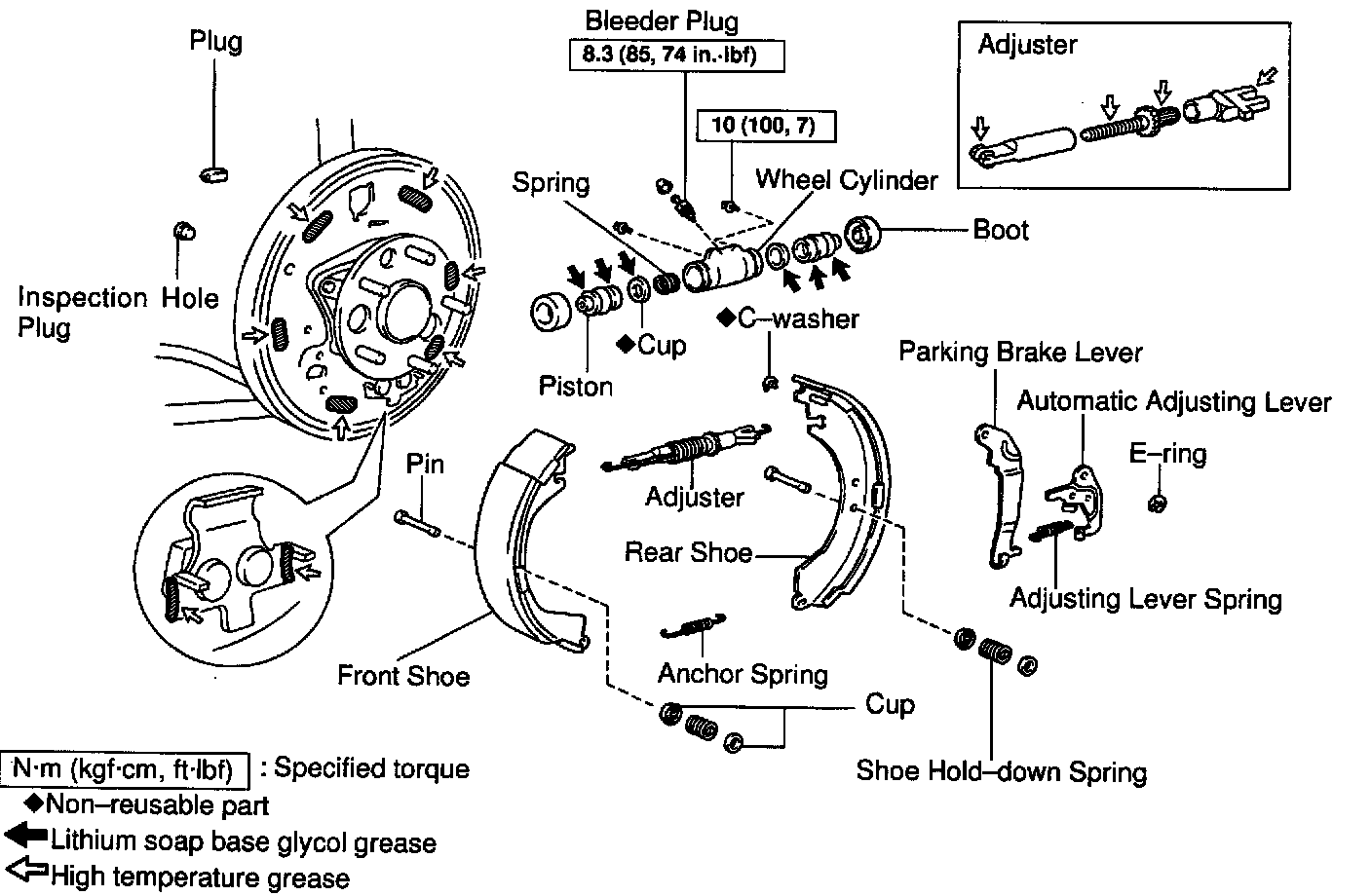 (a) Insert a bent wire or equivalent through the hole in the brake drum, and hold the automatic adjusting lever away from the adjuster.