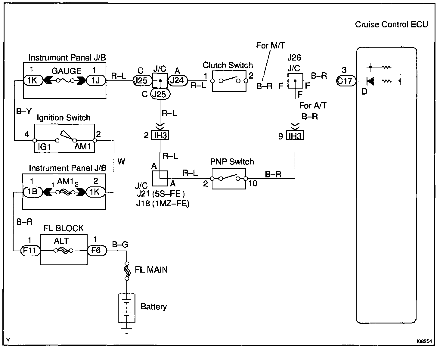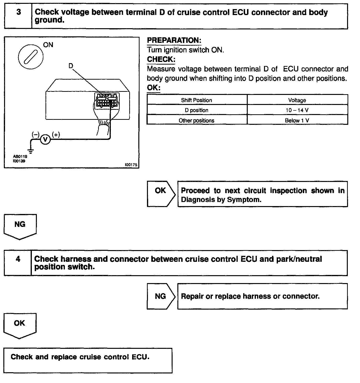 When the shift position is except D, a signal is sent from the park/neutral position switch to the ECU. When this signal is input during cruise control driving, the ECU cancels the cruise control.