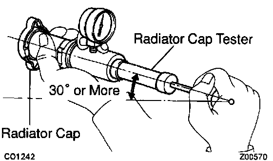 - When performing steps (a) and (b), keep the radiator cap tester at an angle of over 30° above the horizontal.