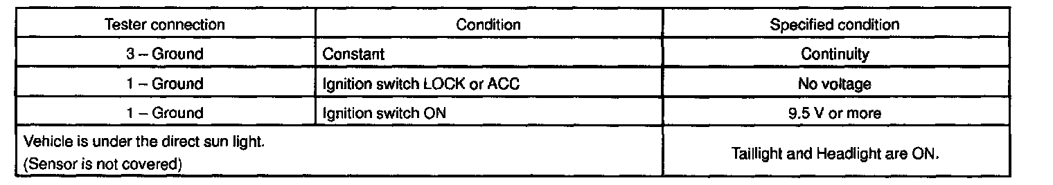 c. Verify that the lights will go out when light control switch position is OFF or the area surrounding the sensor gets bright or open the driver's door while the ignition switch is OFF.