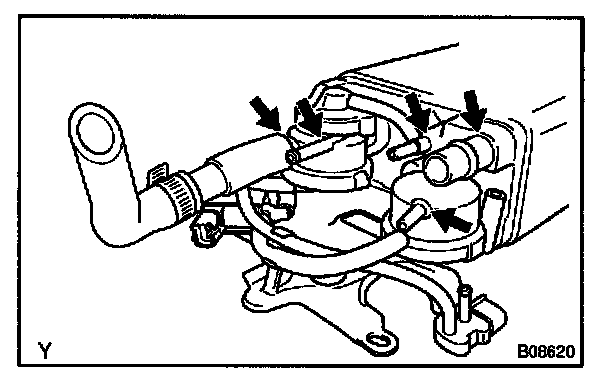 d. Disconnect the purge line hose, EVAP line hose and air inlet line hose from the charcoal canister.