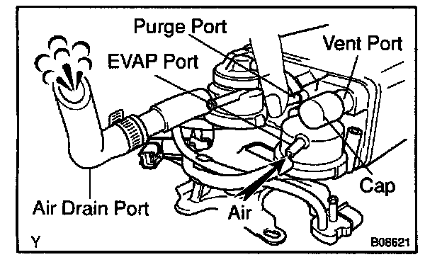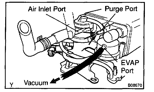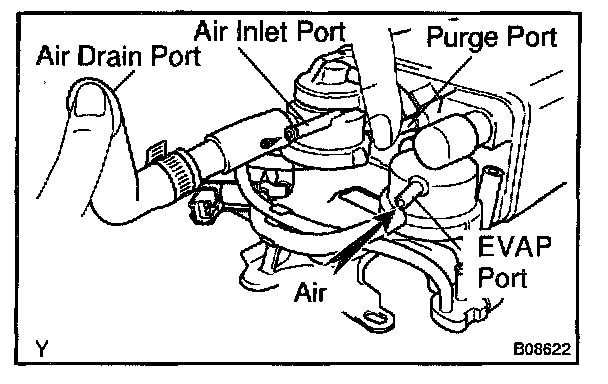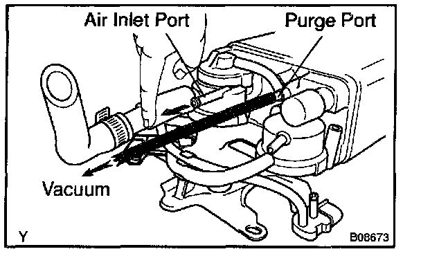 5. While holding the air inlet port closed, apply vacuum (3.43 kpa, 25.7 mm Hg, 1.01 in.Hg) to the EVAP port and check that air flows into the purge port.