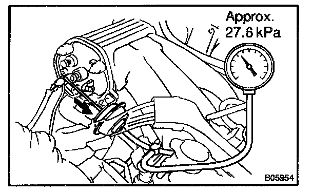 d. Rapidly depress the accelerator pedal to fully open position and check that the vacuum gauge needle momentarily fluctuates up to approx. 26.7 kPa (200 mmHg, 7.9 in.Hg). (The actuator rod is pulled out.)