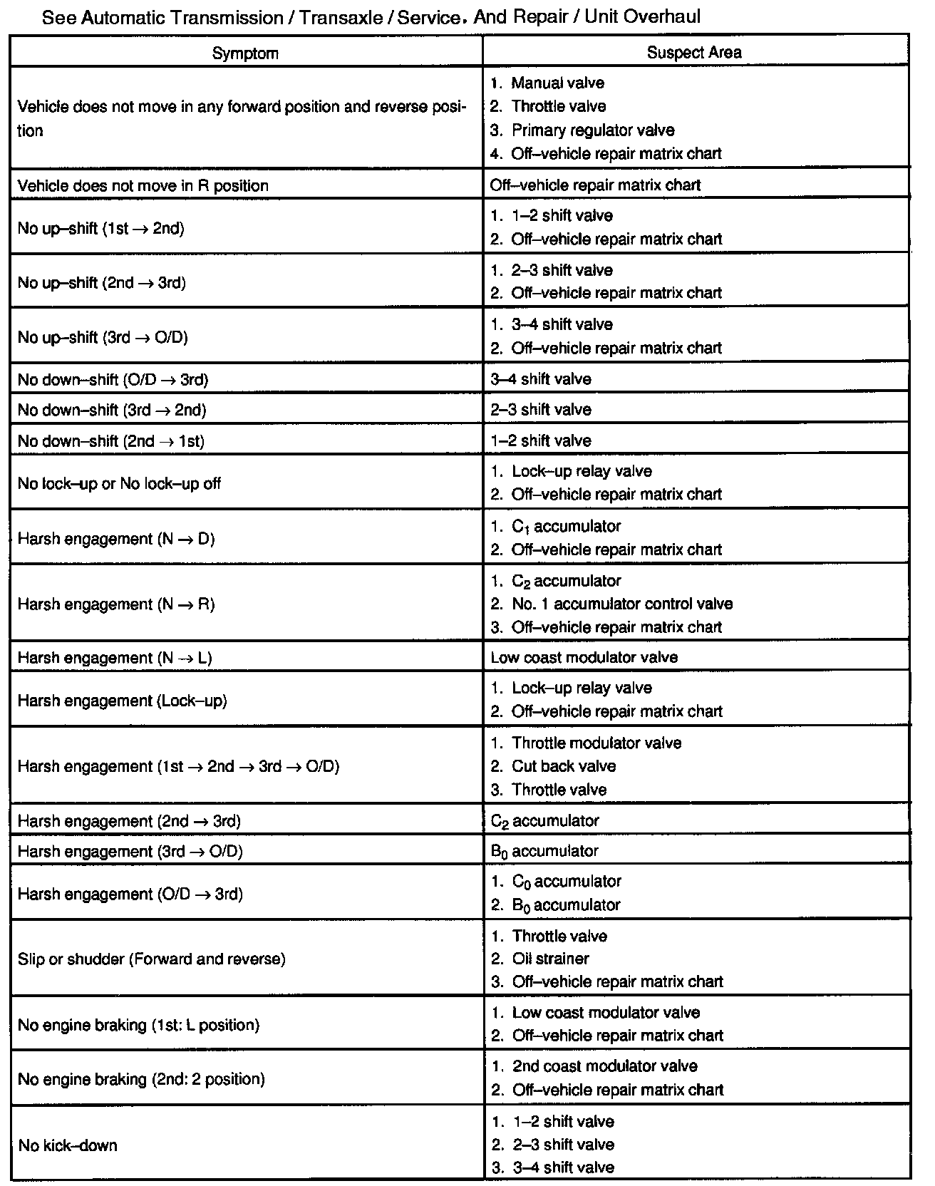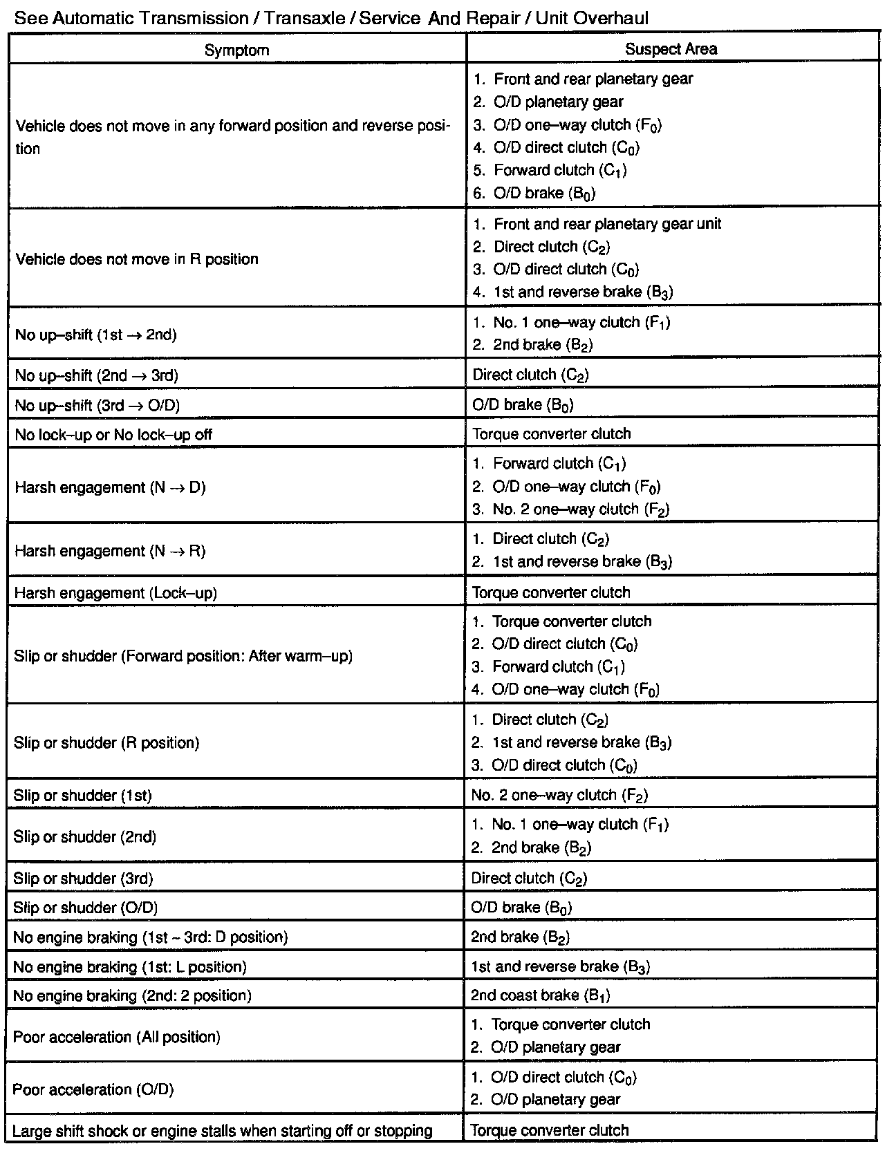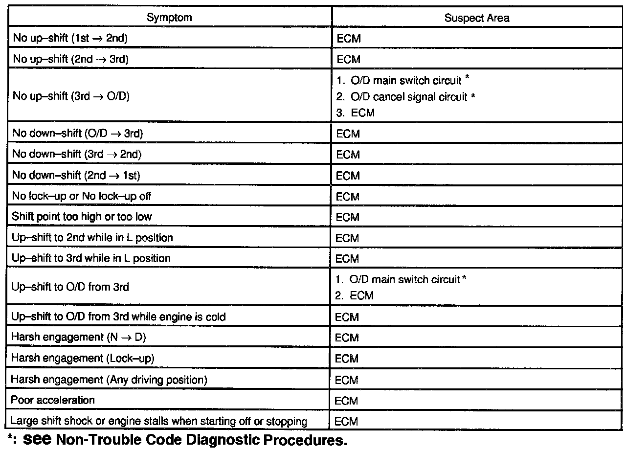 PROBLEM SYMPTOMS TABLEIf a normal code is displayed during the diagnostic trouble code check although the trouble still occurs, check the circuits for each symptom in the order given in the charts and proceed to the appropriate troubleshooting.