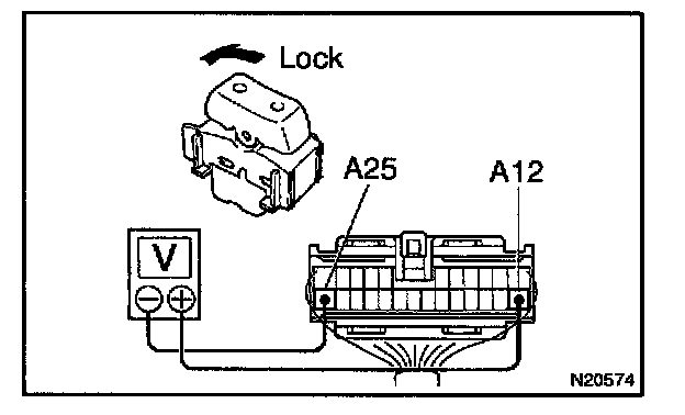 d. Set the door lock control switch to LOCK and check that the voltage rises from 0 V to battery positive voltage for approximately 0.2 seconds.