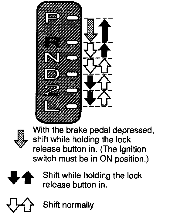 Positions which can be operated only by pressing the shift lever knob button, ignition switch ON and brake pedal depressed P -> R