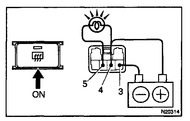 c. Push the defogger switch ON, check that the indicator light and test bulb light up for 12 to 18 minutes, then the indicator light and test bulb light goes out.
