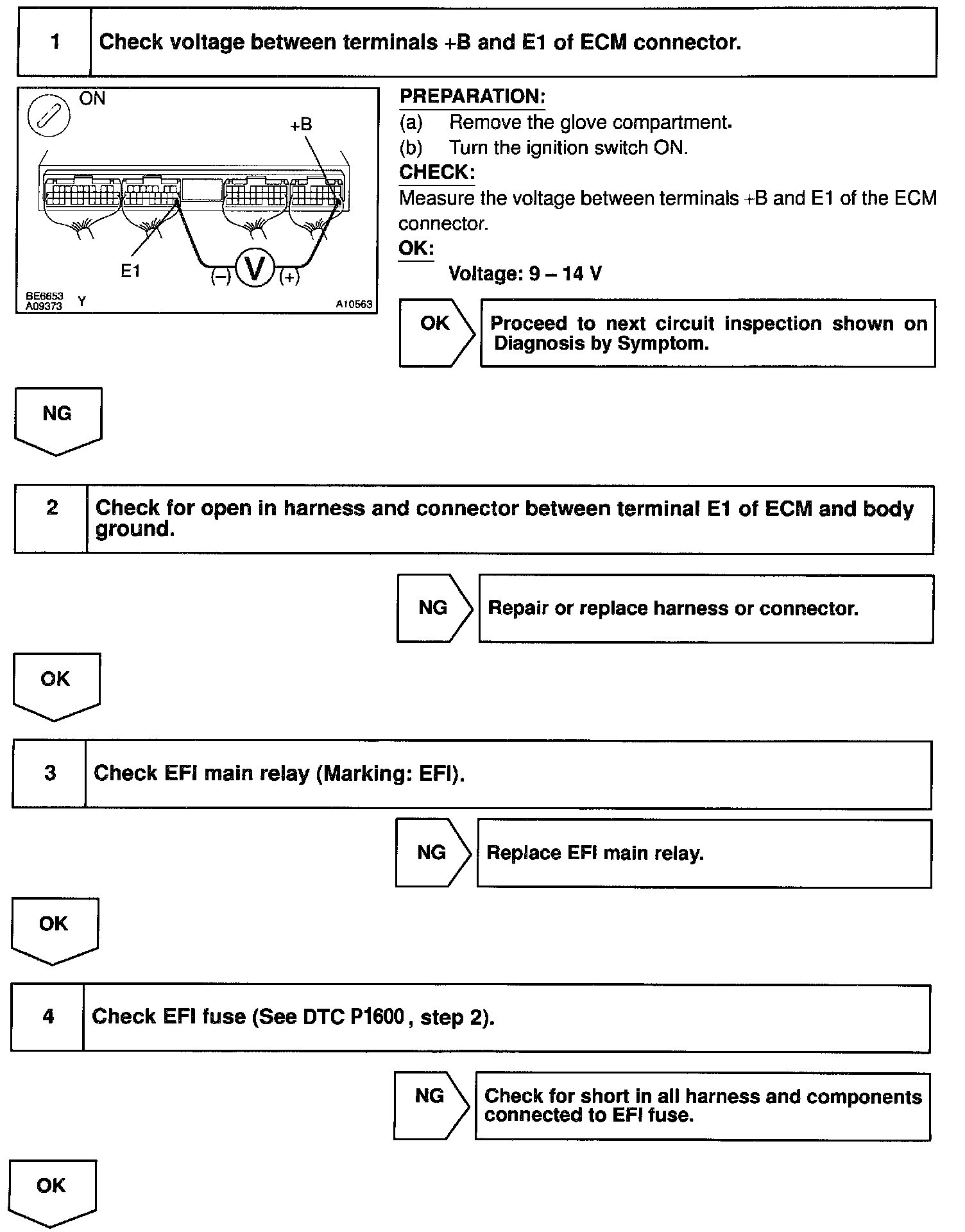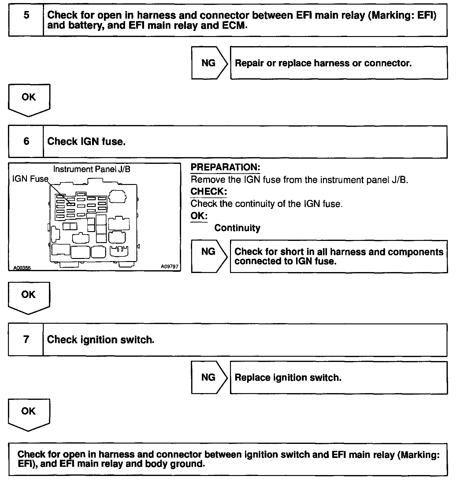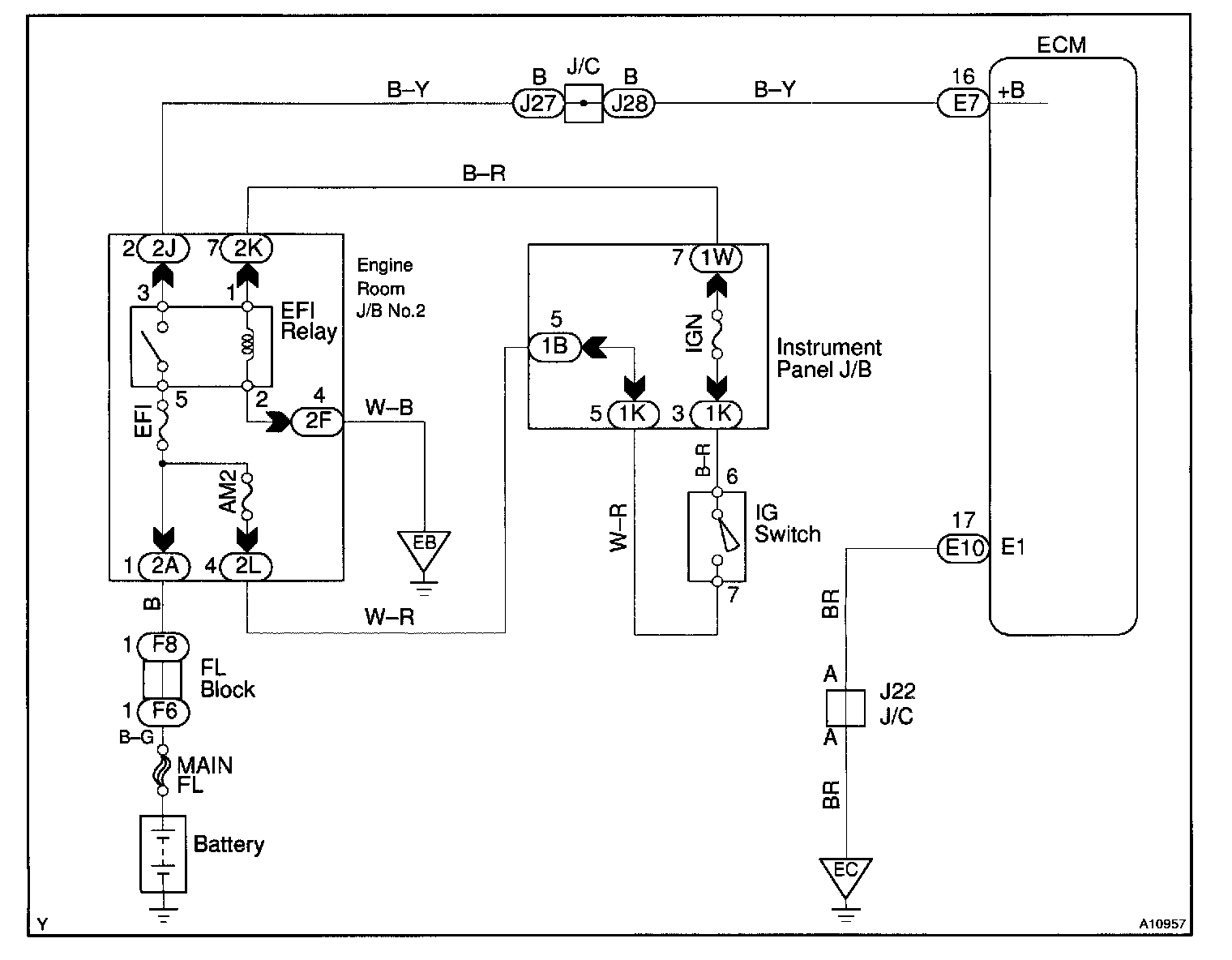 CIRCUIT DESCRIPTIONWhen the ignition switch is turned ON, battery positive voltage is applied to the coil, closing the contacts of the EFI main relay (Marking: EFI) and supplying power to terminal +B of the ECM.