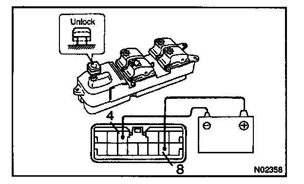 b. Connect the positive (+) lead from the battery to terminal 8 and the negative (-) lead to terminal 4, and check that all the illuminations light up.