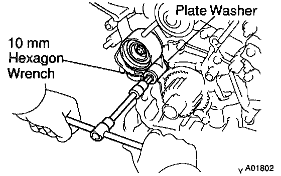 Using a 10 mm hexagon wrench, remove the bolt, idler pulley and plate washer.