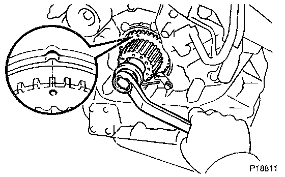 b. Turn the crankshaft, and align the timing marks of the crankshaft timing pulley and oil pump body.
